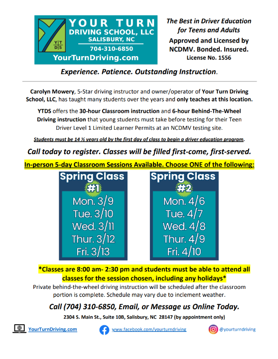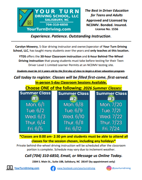for a current student or for a previous student of Your Turn Driving School, LLC with a valid NC Permit or License. Students can request multiple sessions through the office.